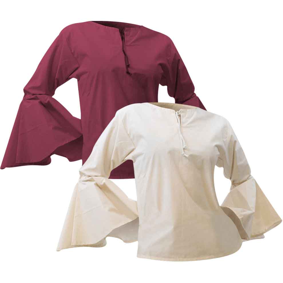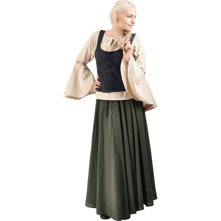 The Felice Blouse showcases gorgeous, voluminous sleeves. Straight and closer-fitting until the elbows, they then flare out and create an elegant draping effect. Add drama to every movement with this medieval blouse. Then, pair it with the easy to wear, lightweight Ursula Light Cotton Skirt. This full length skirt secures with a tie. Over this, layer the Lea Canvas Bodice, with stylish slits along the torso that reveal an inset panel in contrasting color. This bodice has buttoned straps and laces up the front. All these clothing items are available in a range of sizes and colors, so you can create a look that matches your tastes. The Eva Medieval Maiden Outfit can easily suit a range of characters. Finally, accessorize with the Katelyn Womens Medieval Shoes. These are leather flats with ties.