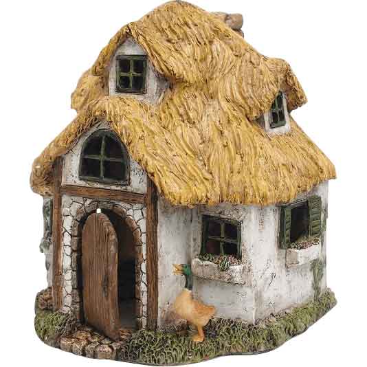 All around the house are windows painted brown to resemble wood. These windows are also shaped like crosses for historical detail. The walls of the house are painted white to resemble stone. The hinged front door can be opened or closed. Beside the front door is a realistic duck for added natural detail. The base is crafted to look like a mossy stone path, allowing you to place this cottage on most flat surfaces.