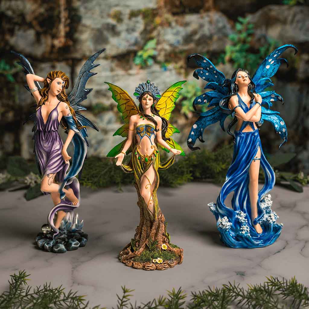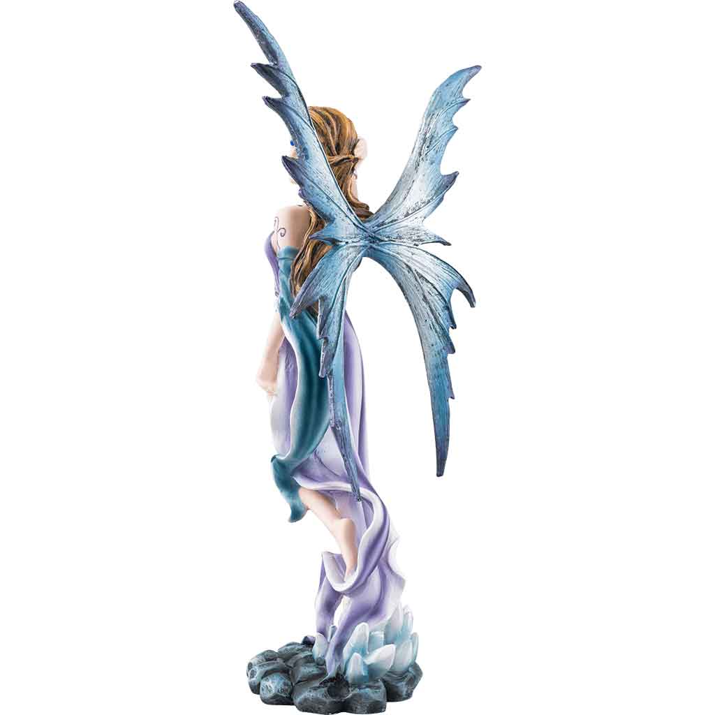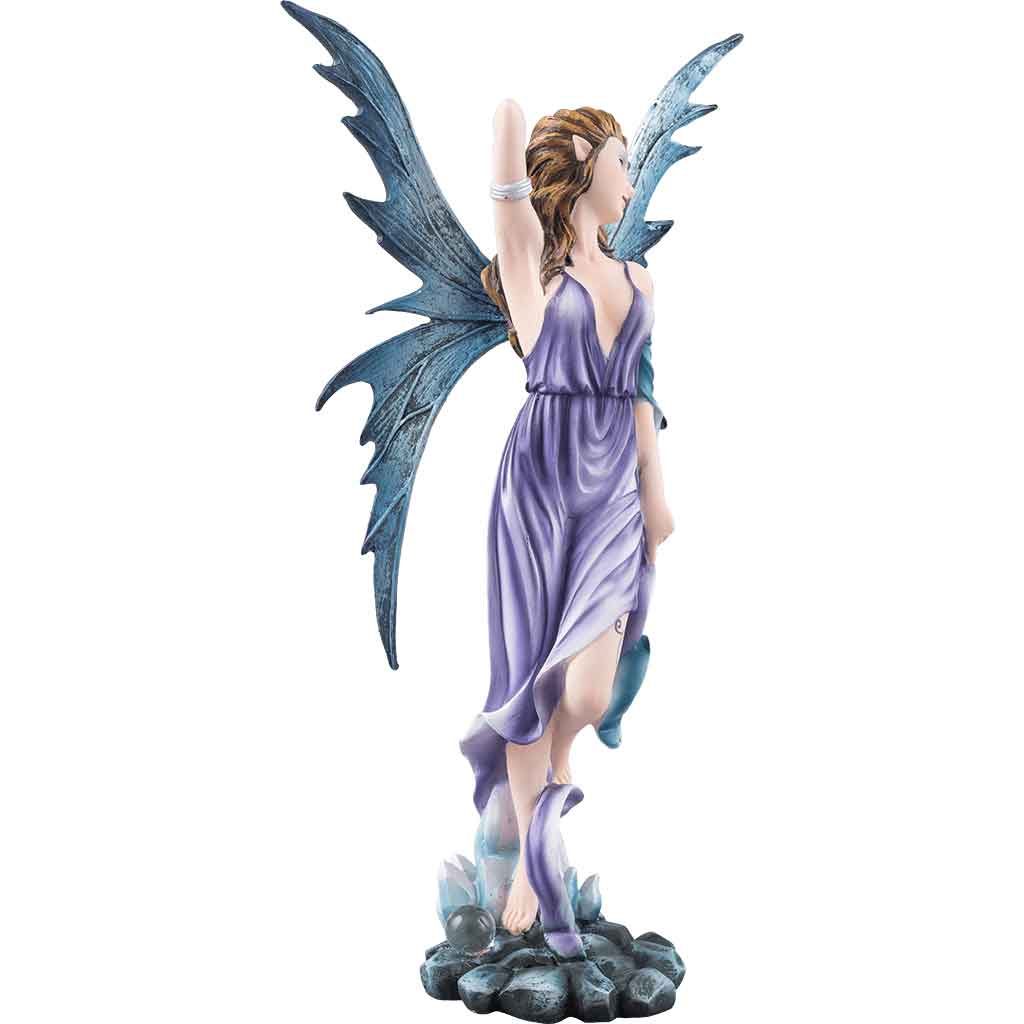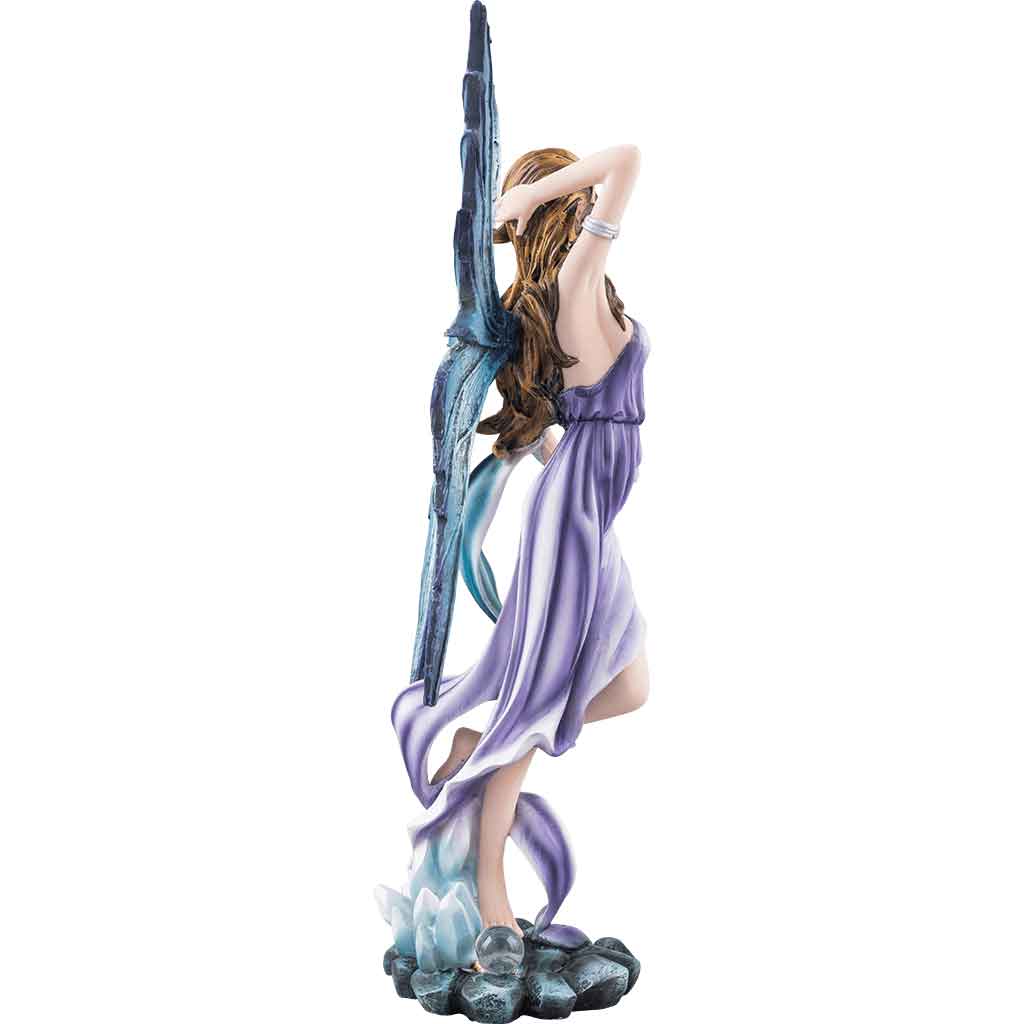 The four elements were a classic part of theory and belief from Grecian times to the Renaissance. This Fairy of Elemental Wind fuses one such element with fantasy design to create a lovely fairy that represents her chosen element. This beautiful pixie dresses in purple with touches of blue, which combine to help her look like clouds in the sky – as perfect a representative of wind and air as there ever was. Her clothing is loose and flowing to better catch the currents of air, and her lovely dress seems to billow and tangle around her as the wind plays with the fabric. Rich brown hair adorns her head, as wind-tossed as the rest of her, and her narrow blue wings are spread behind her, allowing her to ride the wind and the air, if she so desires. Air was also associated with blood, and the sanguine temperament, which could lead one to be flippant and amorous, which helps to explain this fairies carefree and open expression. The fairy statue is crafted in cold cast resin, and hand painting infuses stunning color into its every vivid detail. Those born to the element of air will find this Fairy of Elemental Wind Statue to be a boon companion, as well as a great decoration to have sitting around the home, too.