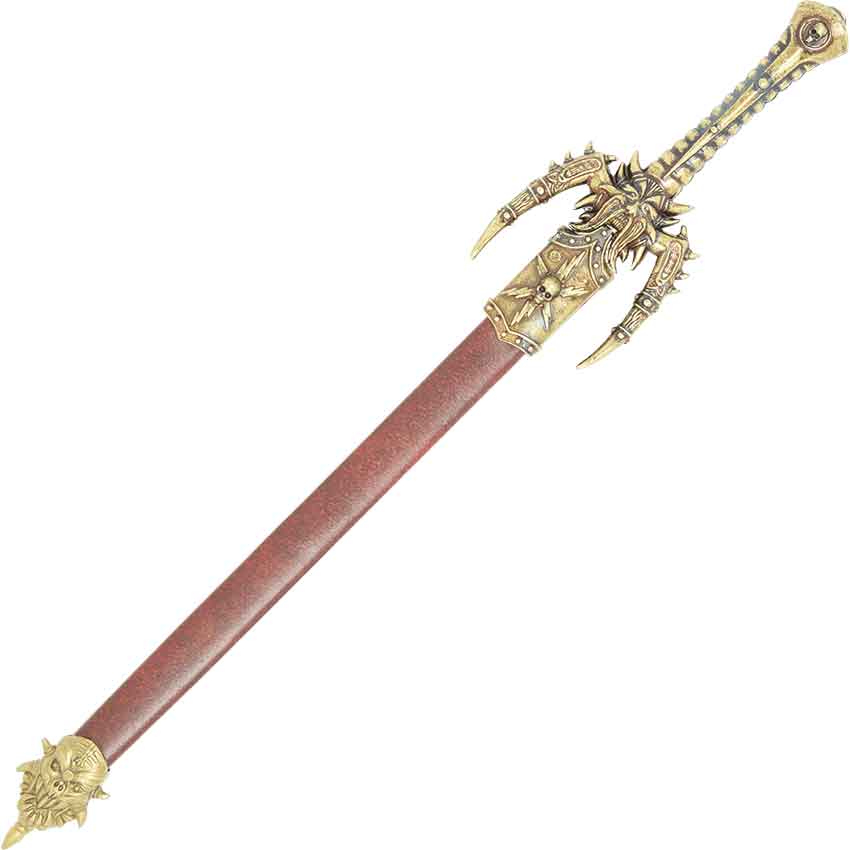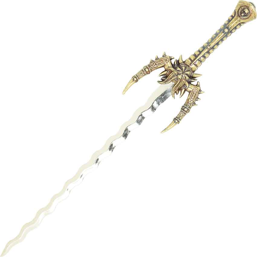 This miniature fantasy sword shows off a flaming blade and grotesque hilt. The fantasy sword letter opener is just like the bigger versions of fantasy swords. The fantasy sword letter opener is 9.5 inches long and is provided with a sheath. The fantasy sword is an excellent letter opener and a great desk accessory. This fantasy letter opener is made in Spain from the manufacturer Denix.