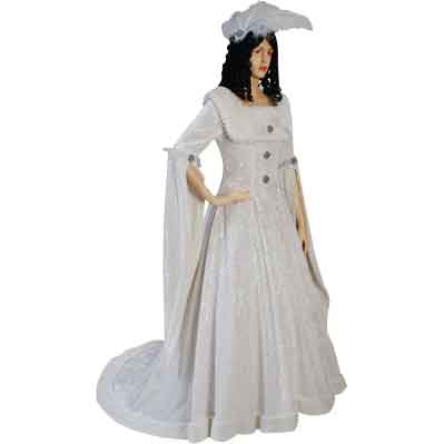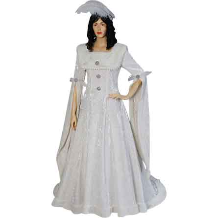 The Feathered Renaissance Dress is simultaneously a simple yet exotic dress that features a near-peerless beauty alongside incredible quality, this dress is made from quality materials and is designed to be the perfect picture of decadent elegance. This dress is made entirely from luxurious crushed velvet, making this dress incredibly soft and comfortable to wear. It also has quite a lustrous appearance, which only highlights the radiant, pure-white color of the entire dress. The dress features white faux fur trim and real ostrich feathers as decoration. A small mantle of faux fur decorates the upper bodice of this dress, while three decorative metal buttons ornament the center of the bodice, ostrich feathers decorate this decorative mantle. The sleeves are fitted to the arm from shoulder to elbow, where they drape decoratively off the arm as elongated cuffs with faux fur trim, the elbow of each sleeve is decorated with an additional metal button as well as additional ostrich feathers. This attractive dress also features a faux fur-hemmed train that trails elegantly behind. Also, the dress laces in the back. The Feathered Renaissance Dress includes a matching white ostrich feather hair clip. This dress is pictured with the A-Line Petticoat (MCI-145), sold separately. This extravagant dress is a brilliant combination of attractive design, excellent construction, and exotic decoration, you’ll be hard-pressed to find a dress that combines these elements half-as-well as the Feathered Renaissance Dress does.
