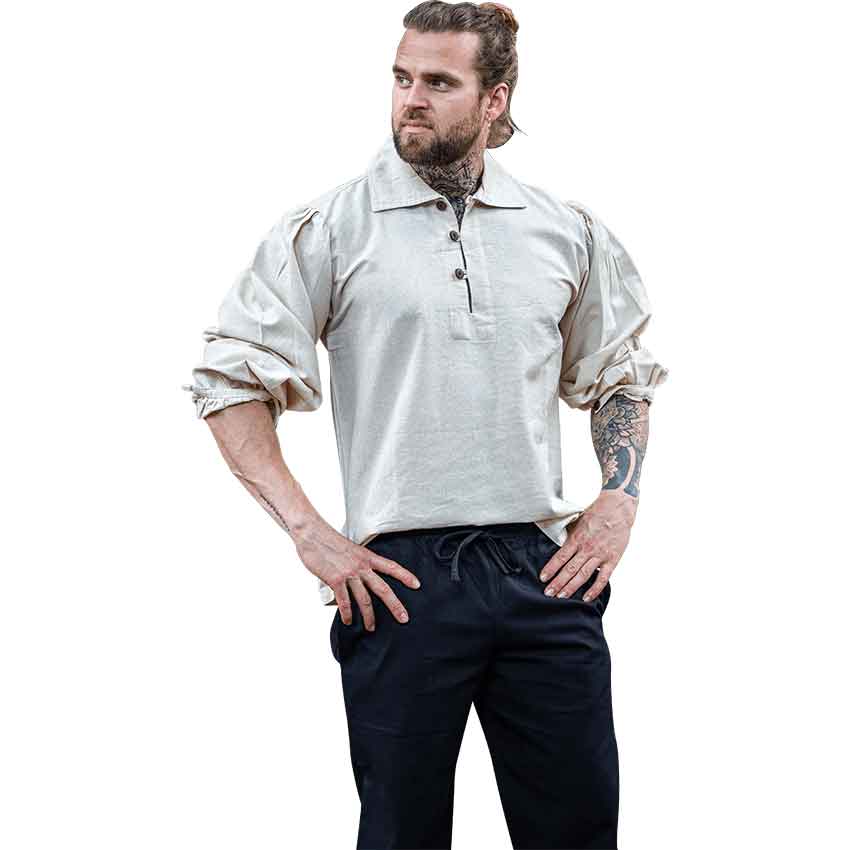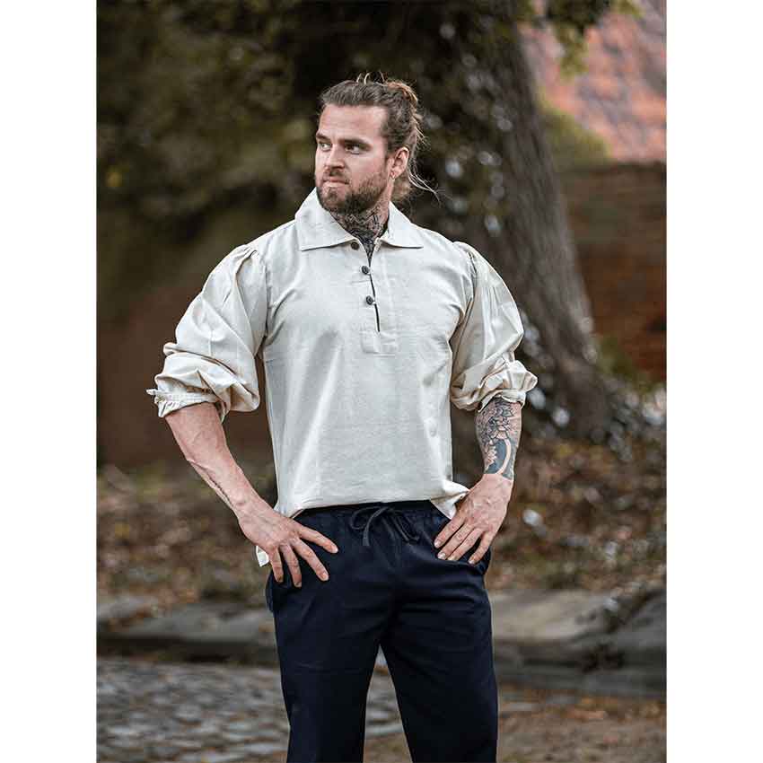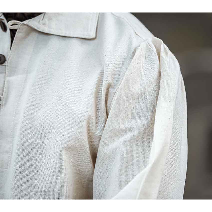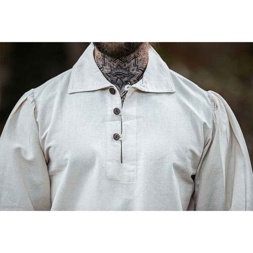 Crafted from pure cotton, this historical shirt is a great addition to your medieval wardrobe. Its natural beige hue adds rustic style to its medieval aesthetic. This long-sleeve shirt has a wide, folded over collar with three wooden buttons from the neckline down the front placket. Fitted slightly at the shoulders and with a straight cut throughout the torso, this medieval shirt has a structure that blends historical style and comfort.