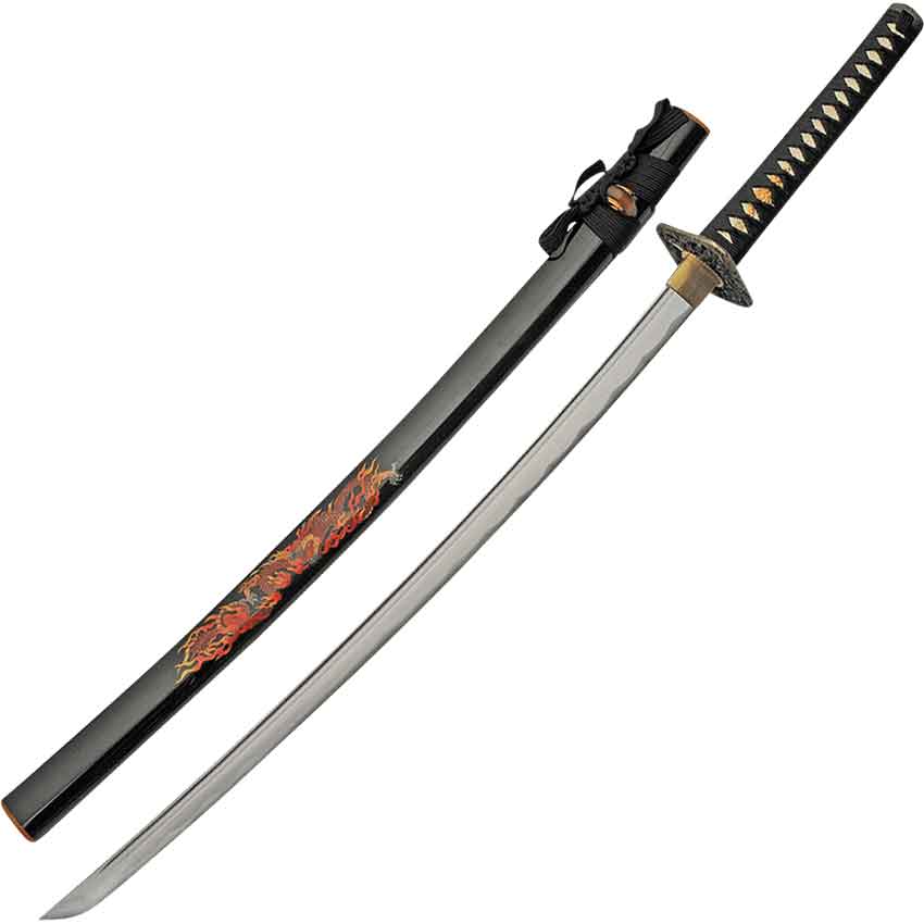 Warrior, you can decorate your home with fearsome style by putting the Fire Dragon Katana on display for all to enjoy. Made from 1045 carbon steel, this decorative katana features a curved blade, typical of Japanese swords. A fuller runs down the spine of the blade.