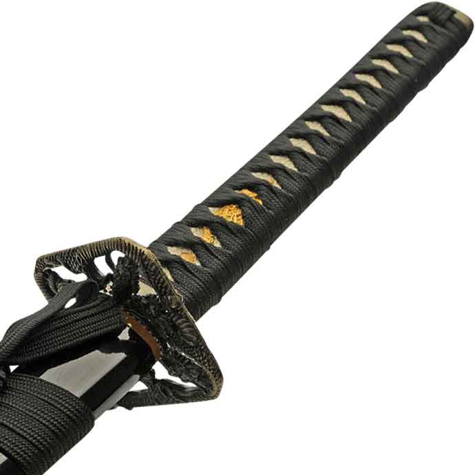 The sword has a brass blade collar before a detailed tsuba. The bronze-colored square tsuba features a dragon design. Then, the hilt has a wrapped grip. Black cord wraps around the cream-colored, faux ray-skin grip.