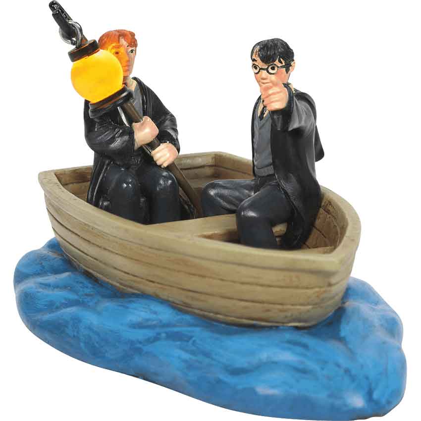 In first year, Harry and Ron shared a boat, beautifully shown in First-Years Harry and Ron from the Department 56 Harry Potter Village. Made from polyresin, this officially licensed statue depicts the famous characters wearing their uniforms and sitting in a small dingy. The light-colored, wood-like boat sits on a blue base. The base has a watery appearance. In the boat, Harry points forwards with his left hand. Ron sits behind him holding the lantern from the boat. The lantern lights up with LEDs powered by 2 C batteries, not included. Put this figurine on display for all to see in your home decor. Potterheads can add it to their collection.