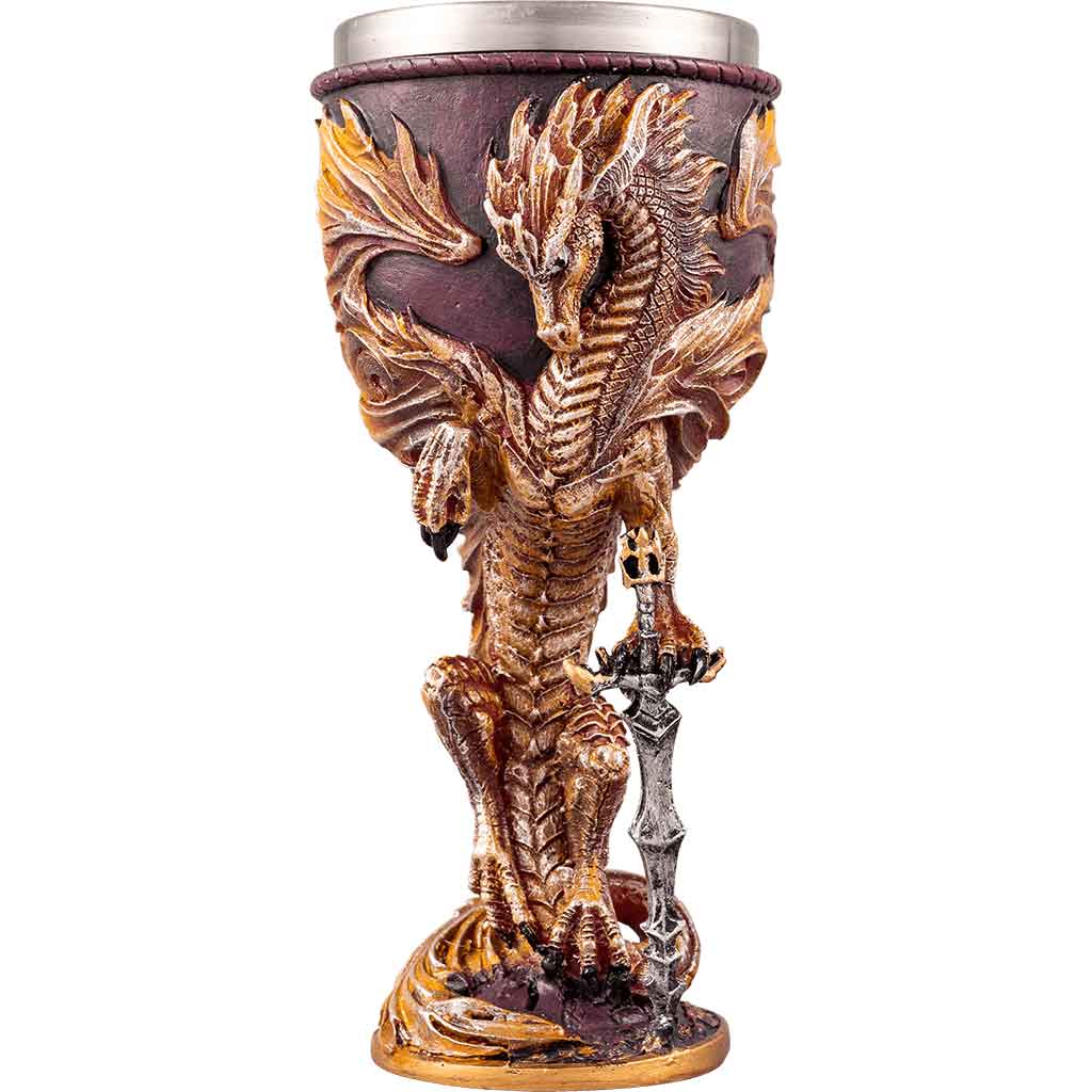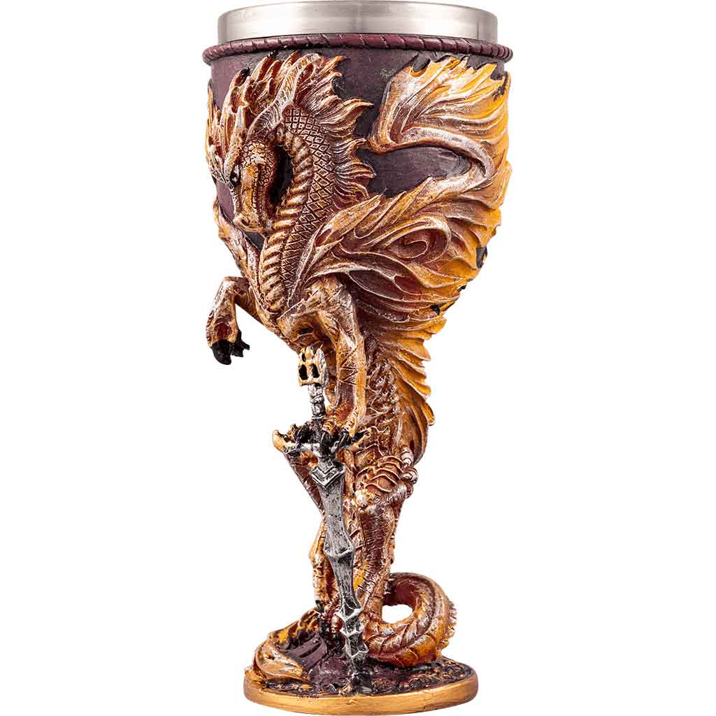 You listen to the bards telling the tale of your great victory against the mighty dragon. You drink from the Flame Blade Dragon Goblet in celebration. Made from cold cast resin, the hand-painted goblet features an inflamed dragon with a red background. It is holding onto a sword as if guarding it. The sword has a unique blade design. Next, the dragons wings and upper body cover the cup of the goblet. Multiple flames make up the dragon wings. Above the dragon is a spiraled cord border. The lower half of the intricately detailed dragon forms the stem and continues onto the base. Its tail curls around the base. Intricate scrollwork also adorns the base. Finally, the fantasy goblet has a steel insert, making it drink-safe. This goblet makes a wonderful display piece or drinkware item for your home.