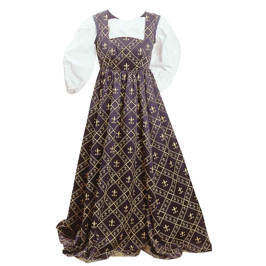 Renaissance elegance in our 16th century styled fleur-de-lis patterned dress. The back of this dress laces up and has a hidden modesty panel, which leaves breathing room after a little too much feasting. We have shown the Celtic Chemise with this dress, however, this dress would still look wonderful paired with any of our chemises. It is available in burgundy or navy blue with gold accents, as well as in S/M or L/XL. The dress is made in 100% poly cotton. Dry clean only. It is a perfect dress for the lady of the castle and very proper dress for the court.