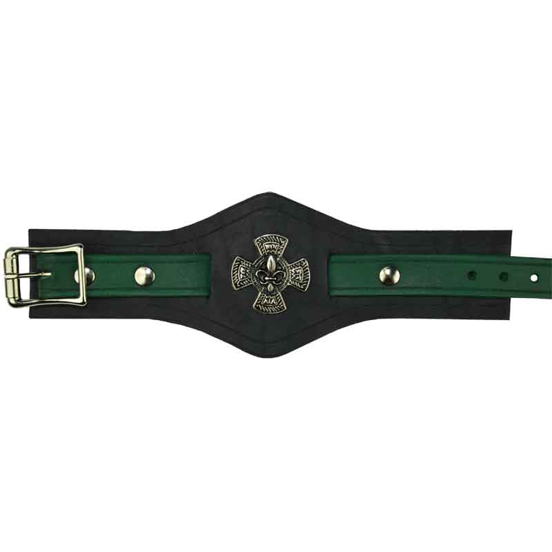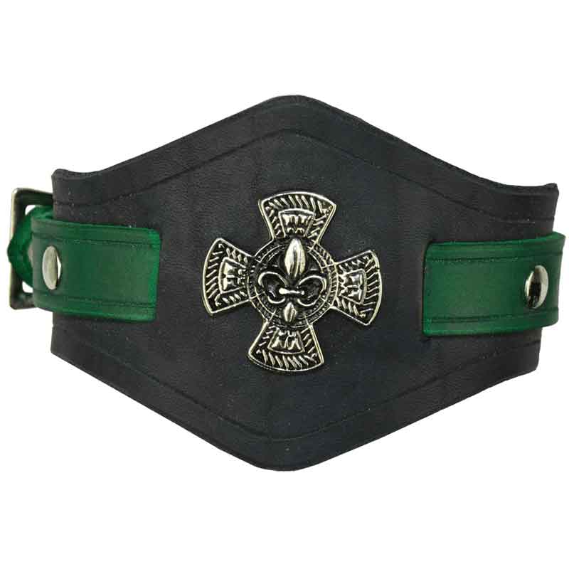 An awesome pair of leather wrist cuffs are a must have accessory for any fair goer. Our leather wrist cuffs are crafted from medium weight leather and are very comfortable to wear. Attaching to your wrist by a strap and small buckle, these leather wrist cuffs are extremely adjustable and will go as small as needed to fit a Child or large to fit an Adult. When laid flat, the cuff itself measures 8.5 inches wide and the way the strap is riveted to the cuff is what allows this great adjustability. These wrist cuffs feature a highly detailed silver cross with Fleur de Lis. The wrist cuff measures 3 inches high at the widest part and tapers down to 1.625 inches to perfectly wrap around your wrist. Available in many color combinations. This version comes with steel hardware.