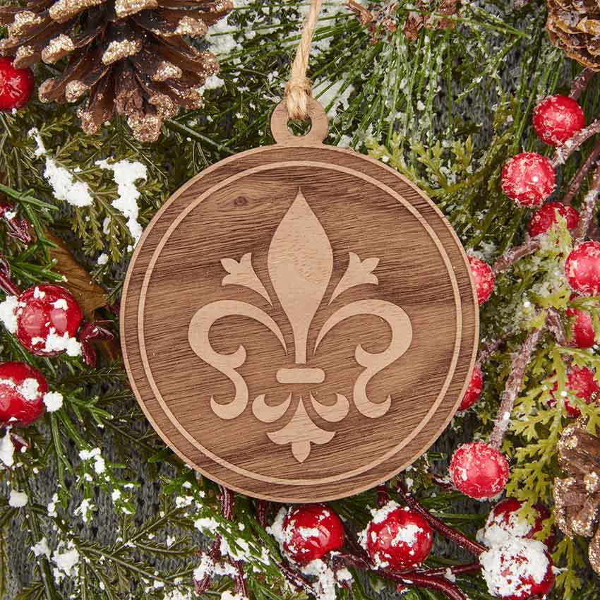 When you want some medieval or Renaissance style in your home for the holiday season, check out the Fleur de Lis Wooden Christmas Ornament. Made from solid walnut, this ornament comes as a single ornament. The ornament has a circular shape with a hole at the top. The hole has an attached rustic twine string for hanging. On the ornament, there is an engraved design on one side. The design has a scrolled fleur-de-lis in the center. There are two lines around the edges, forming a border. This ornament looks great hanging on a Christmas tree as well as with other holiday decorations.