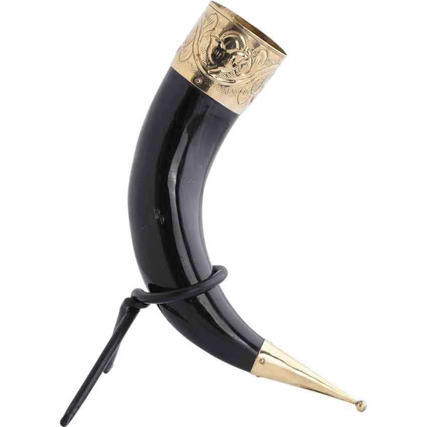 In the great hall, many people are attending your victory banquet. You toast them with the Floral Rim Drinking Horn and then take a drink. Being made of natural horn gives the drinking horn an authentic look and feel. It also has a brass rim and end cap. An elegant floral design adorns the rim. Intricate detailing adds texture to the design. The Floral Rim Drinking Horn looks great as part of a historical reenactment, LARP event, or cosplay. You can also use it to decorate your home or office by using one of our drinking horn stands. It also makes a functional accessory on an adventure with a drinking horn frog.