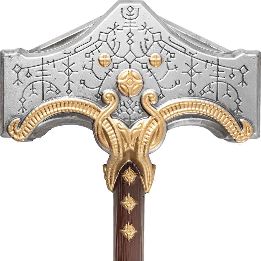 Made entirely from foam, this decorative Mjolnir hammer is a stunning replica of the hammer wielded by Thor in Norse mythology. This foam hammer is an excellent cosplay prop. Starting with the focal point of the design, the hammer is crafted like its mythological counterpart. The mallet head has intricately carved Nordic runes with golden accents. Three circular gold accents are on the head while golden vine work curls around the bottom. Those golden accents also have intricately carved runes on them. The foam handle has a wood-like texture. Its wood finish gives it a realistic look. The wood-like handle has dark brown wrappings carved on it for added depth and dimension. Three golden ring accents adorn the handle. The golden pommel is crafted to look like two horned beasts facing one another. The golden beasts in question have intricately carved grooves.