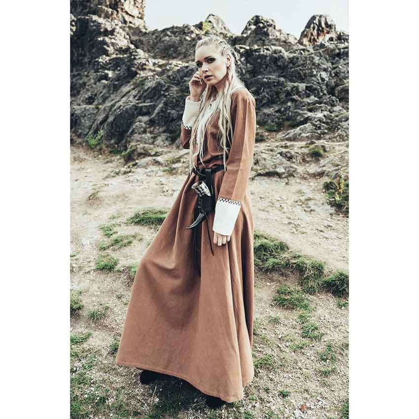 First, this full length Viking ladies dress features long sleeves. Its loose, comfortable fit drapes beautifully and looks great cinched with your favorite ring belt. This Norse maiden dress is perfect on its own or as a layering piece in a Viking reenactment wardrobe.