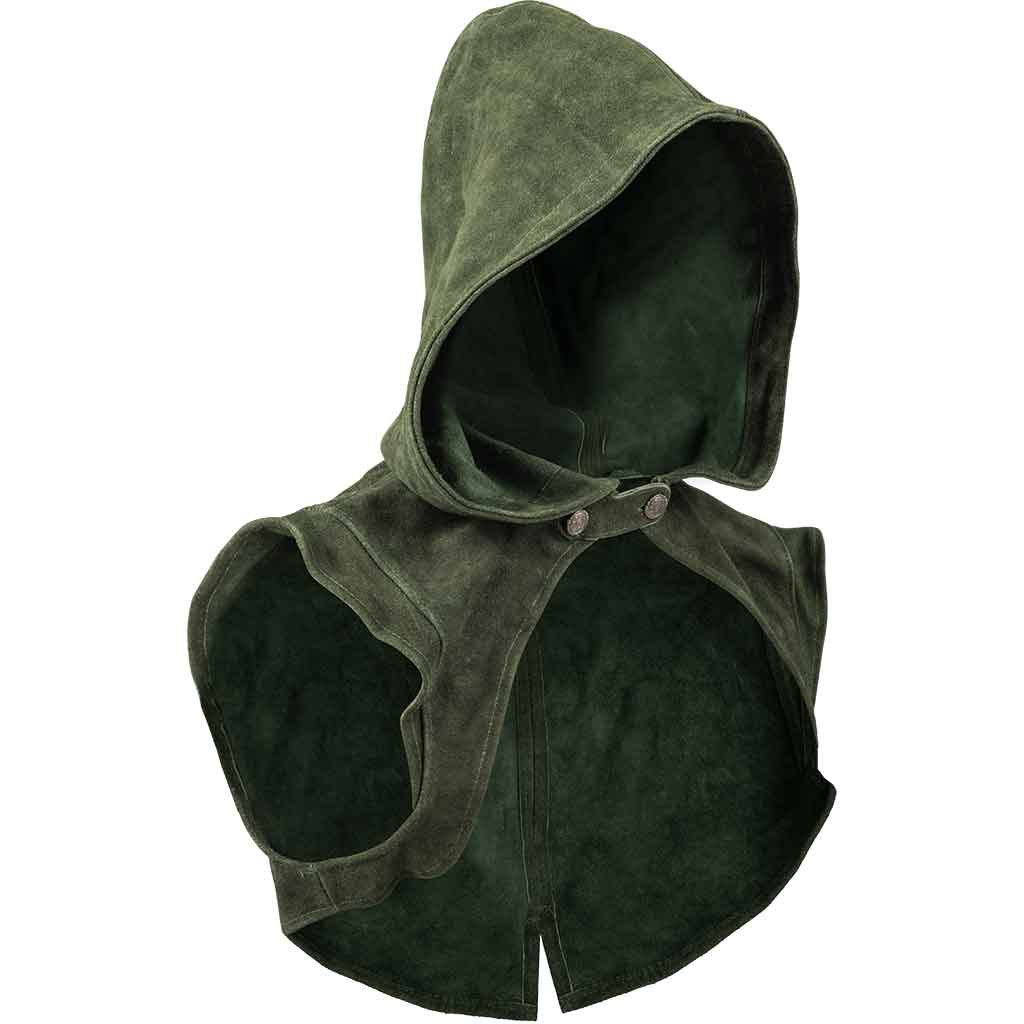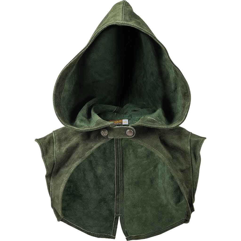 Embark on a new adventure with this medieval fantasy leather hood adorning your ensemble. This medieval hood is ideal for LARP characters who embrace the spirit of adventure. The elegant suede design makes it great for elves and other fantasy-inspired characters making their mark in another world. Rangers, rogues, mercenaries, and more characters will love wearing this suede leather bolero hood. With a variety of sizes and colors available, this medieval fantasy hood complements all kinds of characters making their way through the realms.