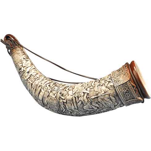For those interested in a showstopping drinking horn to add to their feast, the German Stoneware Drinking Horn makes a great option. Made from stoneware, this cream-colored drinking horn has an intricately detailed design. It features raised-relief decoration. The decoration takes its design from a Peter Duemler horn made in 1883. The design depicts the Battle of the Teutoburg Forest with the Germanic tribes fighting and celebrating their victory against the Romans. The tip and rim of the medieval horn have a brown color. Also, they feature a carrying strap. This amazing piece is safe for drinking and will surely be a statement piece in any drinkware collection. Put this drinking horn on display in your home or office.