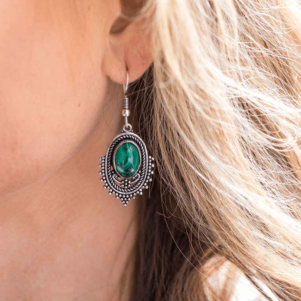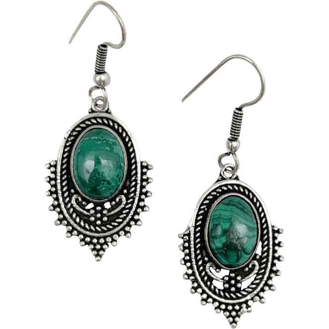Crafted by hand from brass and covered in silver plating, these medieval fantasy earrings let you make a statement of style. They’re sold as a pair. Each earring has a natural Malachite gemstone embedded within. Please note the natural color of these gemstones may vary. Not only do they complement your look, they also add a sense of jeweled charm.