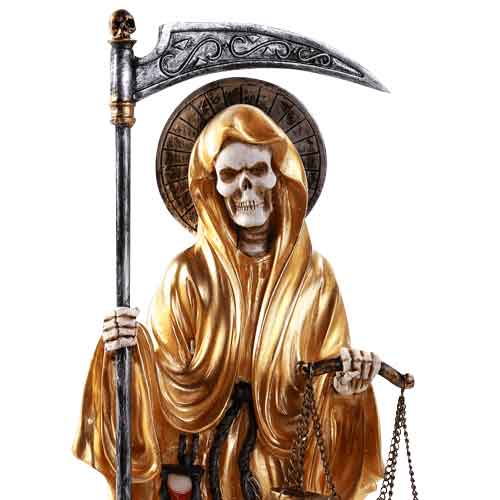 Santa Muerte, or Our Lady of Holy Death, is said to protect those traveling to the afterlife. With the Golden Colored Santa Muerte Statue, you can now enjoy the likeness of this Mexican folk saint in your own home. Hand painted, the brilliant golden colored robes she wears in this statue make this skeleton statue a striking addition to any collection. She appears to stand on a base of copper colored coin shapes with an alert owl at her feet. In one hand, Santa Muerte holds an ornate scythe. In the other, a set of scales. An hourglass is attached to her belt, and a circular halo adorns her hooded skull face. Made of cold cast resin, gift the Golden Colored Santa Muerte Statue to any collector fond of the varied personifications of death celebrated in different cultures.