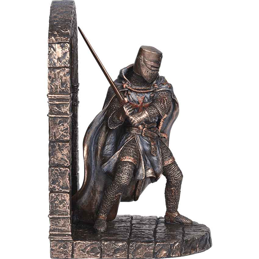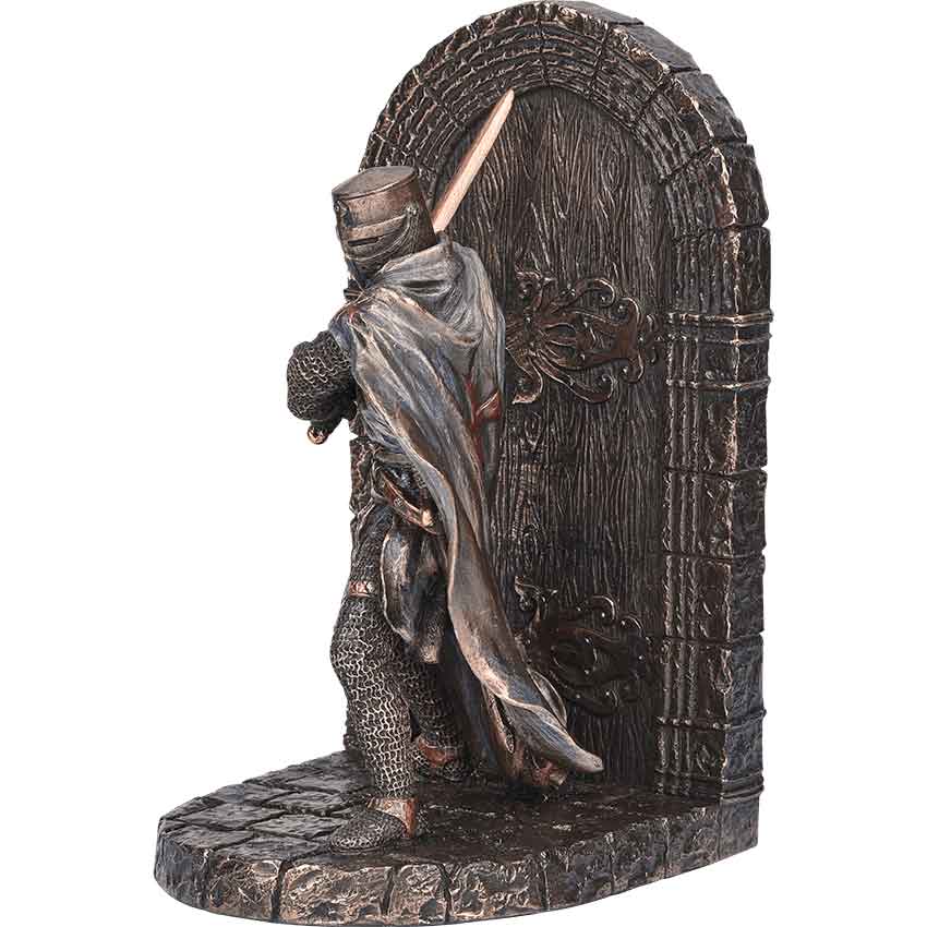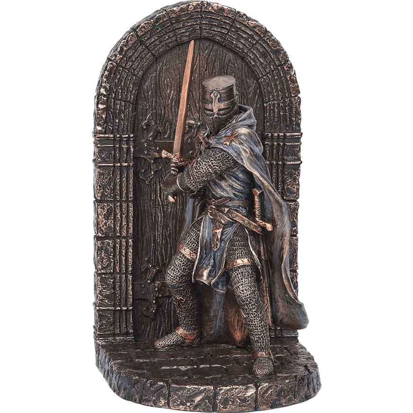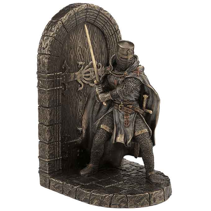 Hold the door, this knight was instructed, and hold it he shall against all opponents. His face obscured by an enclosed helm, this Great Helm Crusader Guarding Door Bookend will also hold your favorite military history books upright. He wields a two-handed sword, with a second sword hanging from his belt. His blue tabard and cloak feature red eight-pointed crosses, similar in design to the Maltese cross. Crafted from cold cast bronze, this bookend exhibits intricate detailing, including the wood-grain on the door and the chainmail armour. Hand-painted in metallic tones of red, blue, and bronze, this single bookend will protect your medieval and fantasy books. Display this medieval soldier bookend alone, or it pairs well with the Norman Crusader Guarding Door Bookend (WU-1661), sold separately. Perfect for reenactors and medieval writers, this Great Helm Crusader Guarding Door Bookend makes an excellent gift or personal accent.