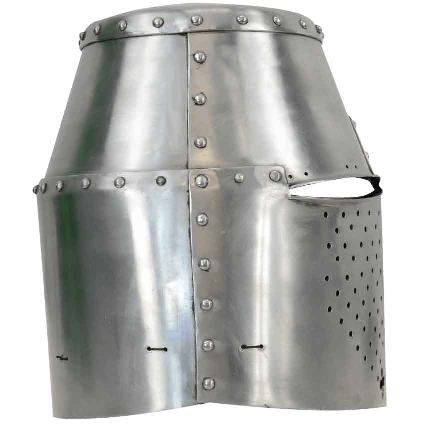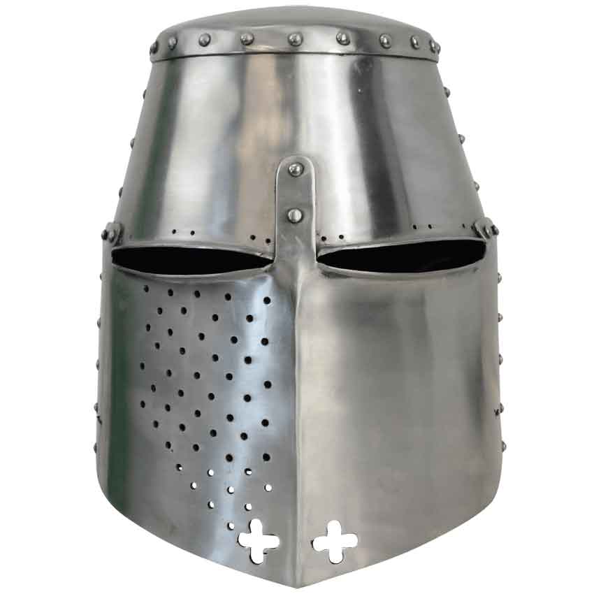 In case you want to fight off your enemies in battle, the Great Helmet provides a way for you to protect your head from attack. Made from 14-gauge steel, this silver-colored helmet comes in two sizes. The knights helmet secures onto the head with a leather chin strap.