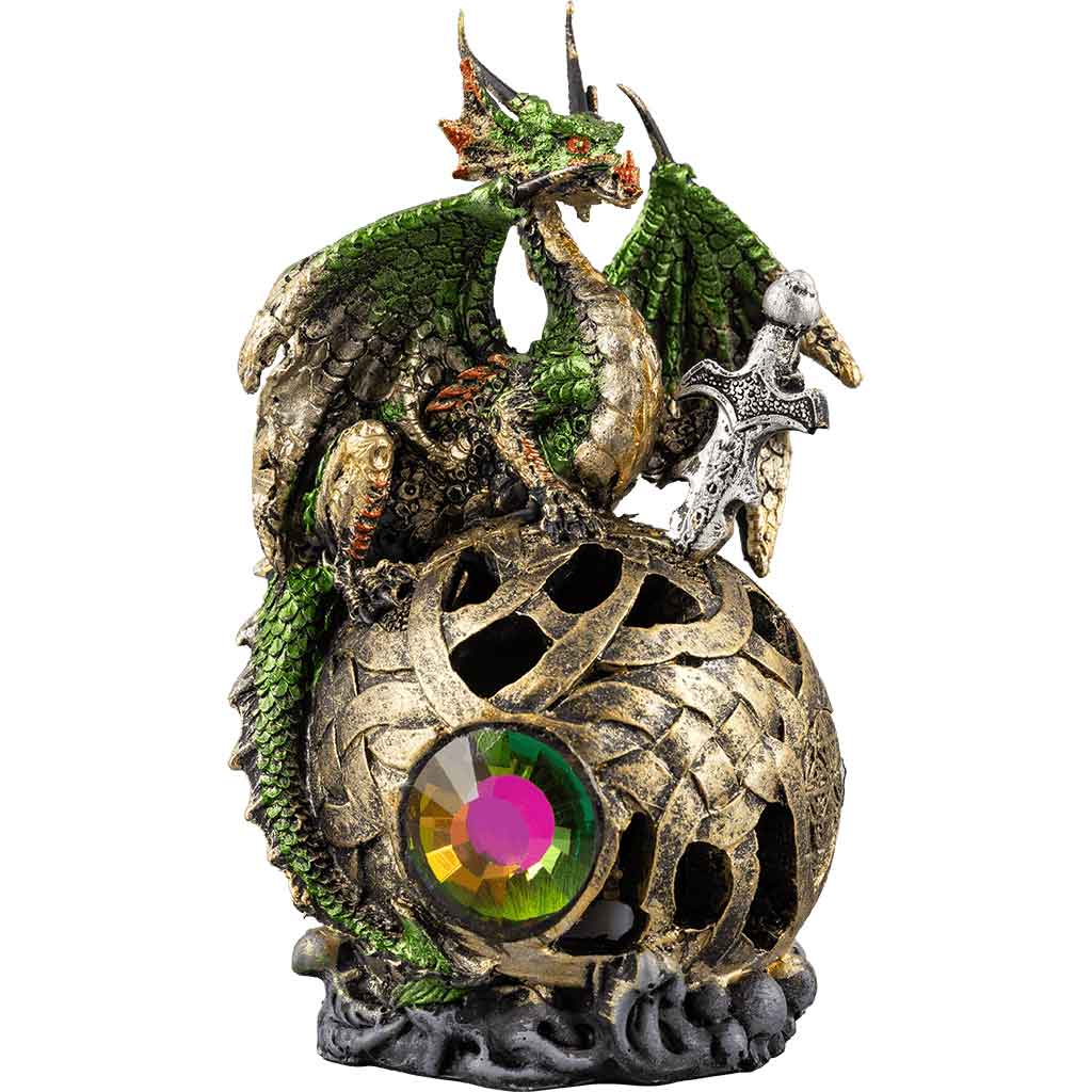 Straight from a legend, this Green Dragon Sword LED Globe brings a touch of fantasy to our realm. A creature that has captivated the imagination of man is now available to enhance the look of any room inside of your home. This unique statue was constructed from cold cast resin and illustrates an image of a dragon perched near a sword on an LED globe. Featuring a stunning level of engraved detail within the scales, tail, wings, and intimidating face, this fabled beast seems almost lifelike. The blue orb below him is encased in a series of golden braids that form at the center around a dazzling accent gem. Confidently place this statue anywhere with the rock styled base that enhances this fantasy scene. The elegant Green Dragon Sword LED Globe is a wonderful way to accent your home or office, so grab one today.