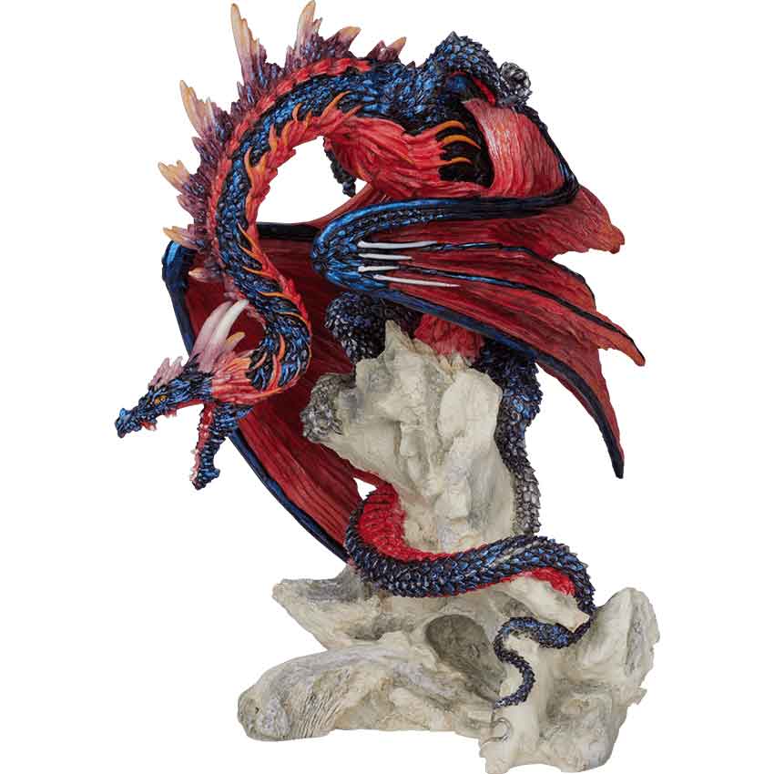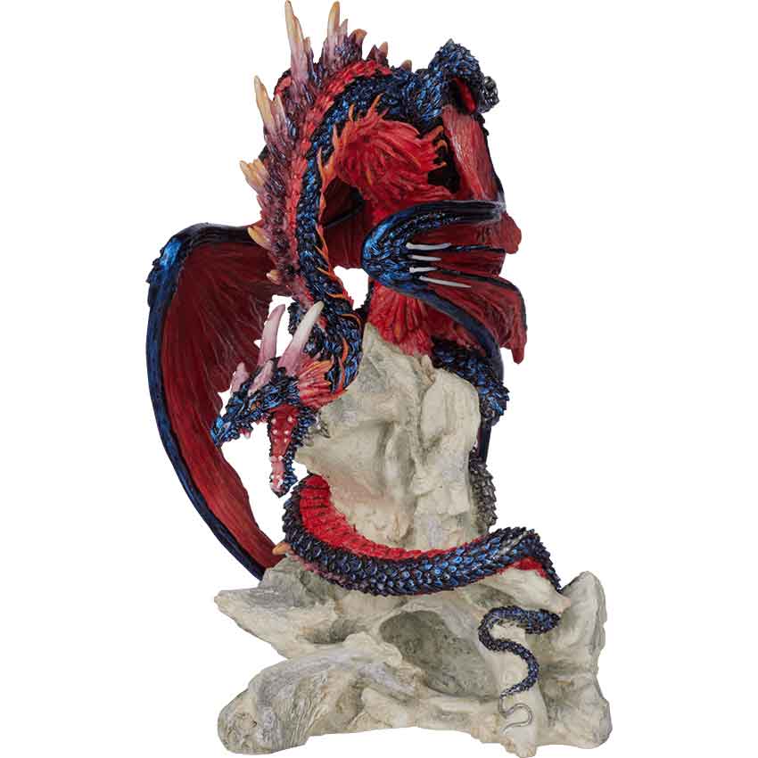 With its fearsome maw open wide in fury, the dragon of the Grim Guardian Dragon Statue is getting ready to attack. Made of polystone, this hand painted statue extraordinarily details the flame-like spikes of the fantasy beast. The dragon is mostly black with red wings, spines, and horns. With their orange tinge and tendril-like shape, the spikes along its underbelly and within the folds of its wings resemble flames. Perched on a light gray stone structure, the dragon has its wings folded down around it, its front claws posed back and its neck extending forward. Its long serpent like tale curls around the base. Let this frightening fantasy dragon guard your shelves, desks, and displays when you decorate with this hand painted polystone collectible.