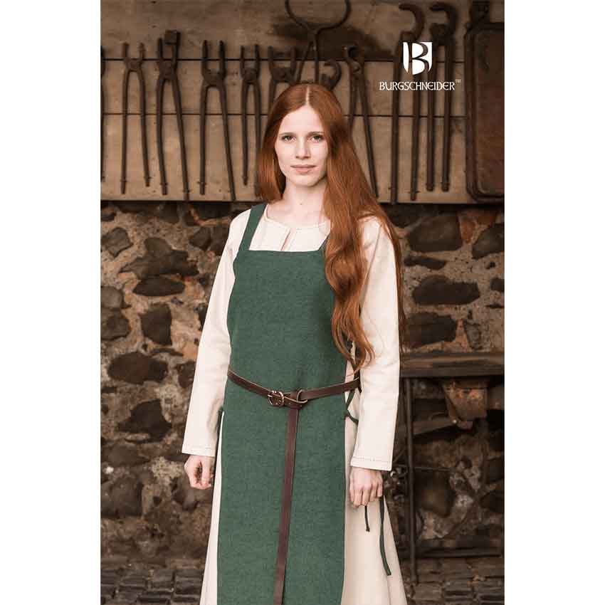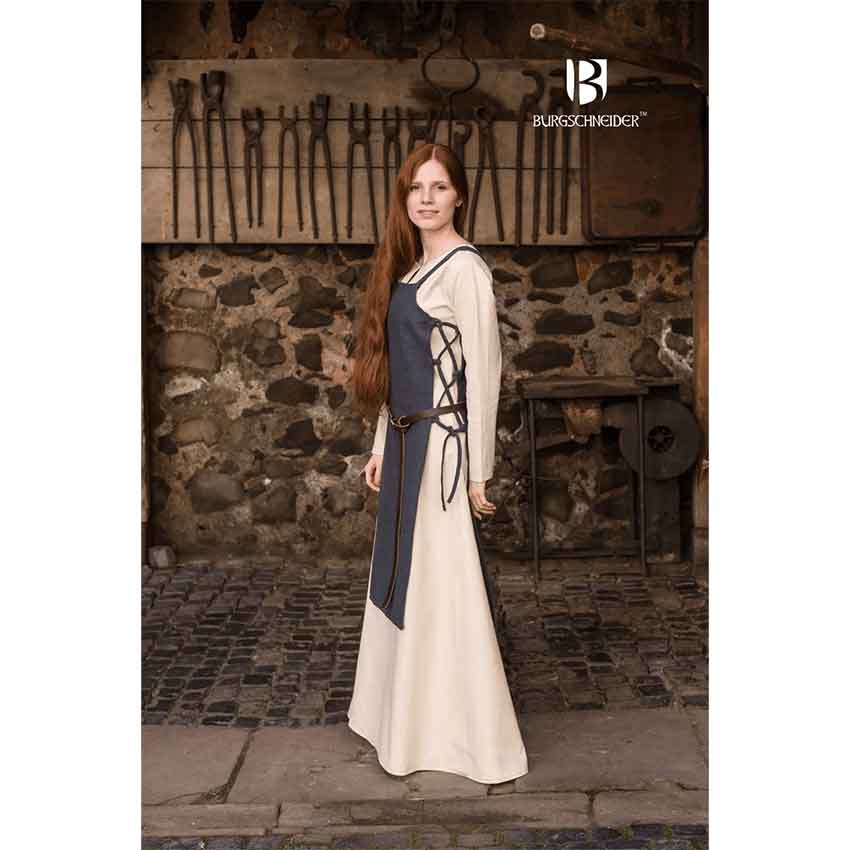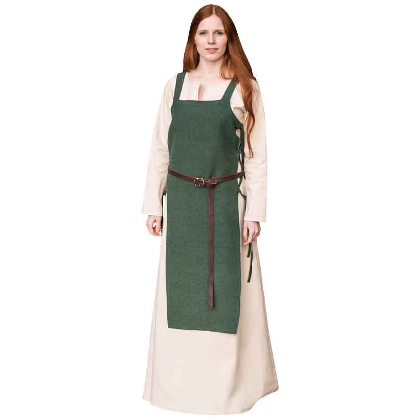 Gyda Eiriksdatter was a Norse queen who pushed Harold Fairhair to unite all of Norway under one ruler. A noble task like that requires power, poise, and steadfastness. The Gyda Eiriksdatter Viking Apron Dress reflects each of these qualities. This authentic cotton outer garment is based on the clothes worn by Vikings during the Middle Ages and fits loosely over the body for comfortability and ease of movement. Its front and back are held together by lacework along the sides, which also serves to make the outfit more adjustable. Its length ends just below the knees, allowing the legs to maintain a large range of motion, and the dress forsakes sleeves for historically authentic shoulder straps, preventing the arms from becoming restrained. The Gyda Eiriksdatter Viking Apron Dress comes in blue, grey, green, or hemp, making it a versatile component of any medieval ensemble, especially those of warriors, smiths, or Viking rulers.