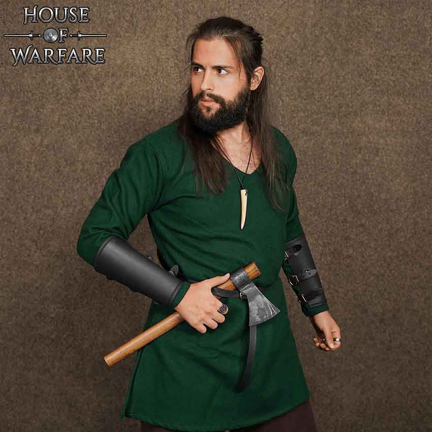 Calling to all Vikings, mercenaries, rogues, and many more. Add the Black Handcrafted Medieval Leather Bracers to your next cosplay or outfit. Made from 2-3-ounce leather, this medieval arm armour comes as a pair. Overall, the black warrior arm armour has angled sides. Also, the medieval bracers have straight edges near the wrists and gently curved edges near the elbows. Leather trim runs along the edges at the wrists and elbows.