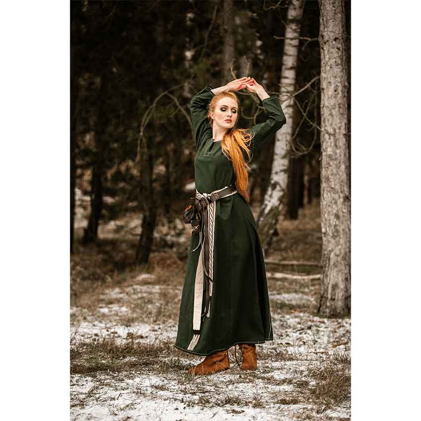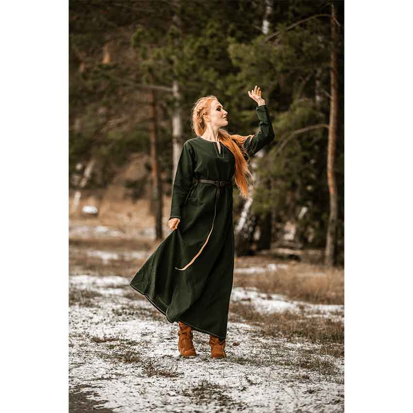 This Viking fantasy underdress is a great base for outfits, cosplays, and character ideas. Whether you are envisioning using it as the base layer for your next costume or simply adding a belt for a casual look, this medieval dress seamlessly adapts to your style. Imagine wearing this medieval gown as you stroll through a bustling Renaissance fair.