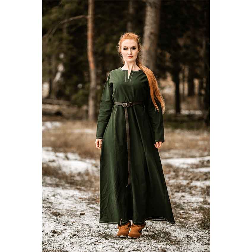 Crafted from pure cotton, this underdress is an excellent base for your outfit ideas. It’s green for a natural look. This ankle-length Viking chemise features a round neckline with a center split and long sleeves. The neckline, sleeves, and the hem have detailed white stitching for a beautiful contrast against the green. With its range of sizes, this dress accommodates diverse body types. This ensures everyone can feel like they belong in the Viking Age.