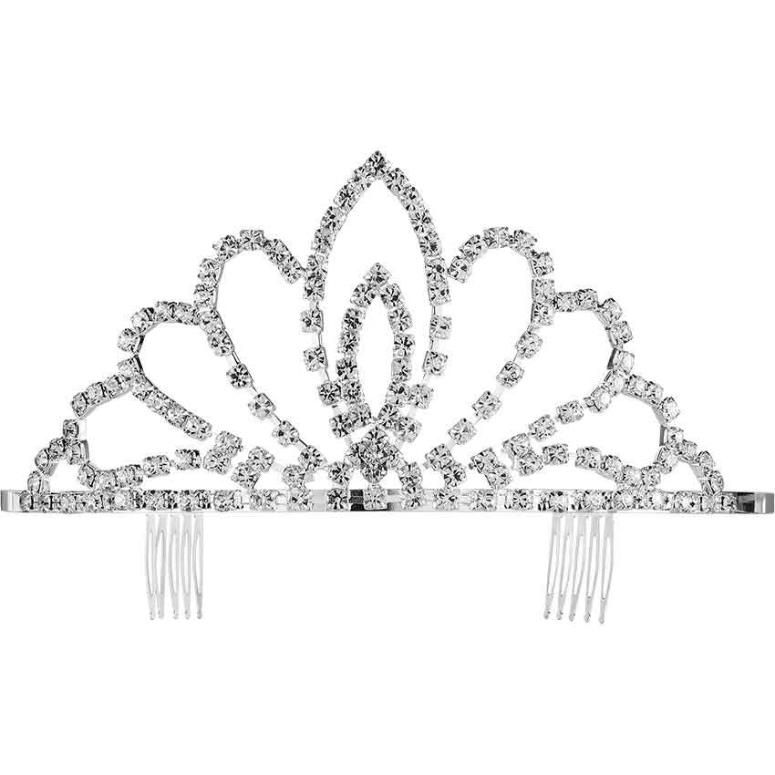 Rule over your kingdom with style by wearing the High Lady Regal Tiara. It is a great finishing touch for your medieval outfit. Made from electroplated copper, this silver princess tiara has a U-shaped band with combs on the ends for securing onto the head. Clear rhinestone crystal accents cover the front of the medieval crown. In the center, there is a tall, pointed ellipse. It has a smaller ellipse inside of it. On each side, there are three curled lines of rhinestones. You can wear the High Lady Regal Tiara for a variety of events, from medieval festivals to formal occasions.
