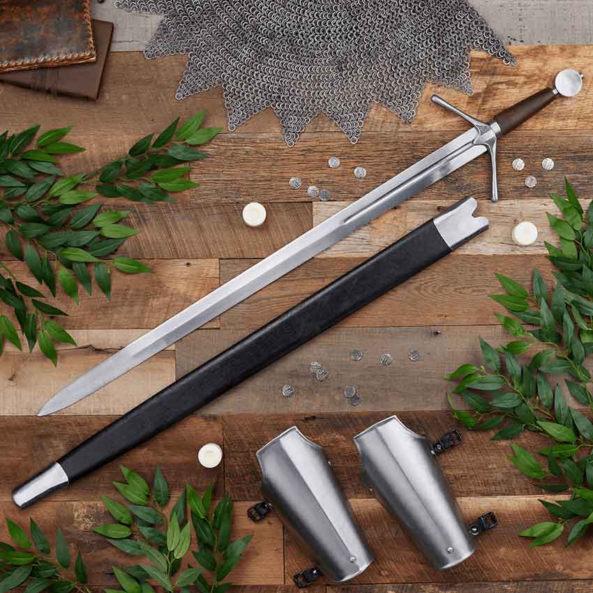 Featuring a subtle touch of Scottish design, this Highland Arming Sword is the type of weapon that any knight would be glad to wield – possessed of effective form and a long blade, while still having a bit of stylish design to its appearance, as well. This impressive sword features a traditional long sword style blade, one that is longer than the typical arming sword, with a similar width and waist. The straight-edged blade features a short fuller on its hand crafted steel blade, while the edges remain straight till, near the tip, they taper to form a fine point, making this sword look all the more like a cut and thrust blade. The concave guard angles sharply towards the blade, while the guard is wrapped in black leather, to offer a better and more comfortable grip when held. The hilt is finished off with a polished, cast-steel wheel pommel, which matches the finish of the guard. Included with the sword is a wooden, leather bound scabbard, fitted with steel pieces on its throat and chape. Distinctive for its form, this Highland Arming Sword is an ideal blade to hang in your castle as a symbol of power and conquest, or an equally great blade to carry at your side, to demonstrate your prowess as a warrior and conqueror.
