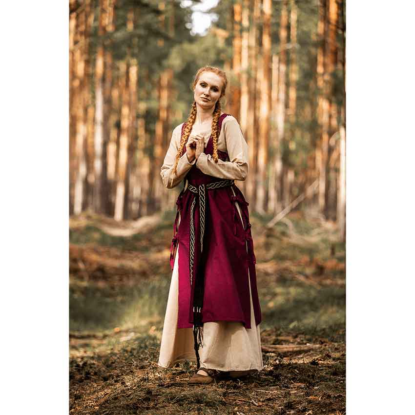Wearing the Red Hildegard Viking Overdress, you can walk in the forest or in the village with some truly classic Viking style. Made from 100% cotton, this deep red Norse overdress comes in three sizes. It secures with multiple ties on the sides of the dress. The sleeveless overdress features the typical square neckline common to apron dresses. Also, the Viking dress ends at the shins.