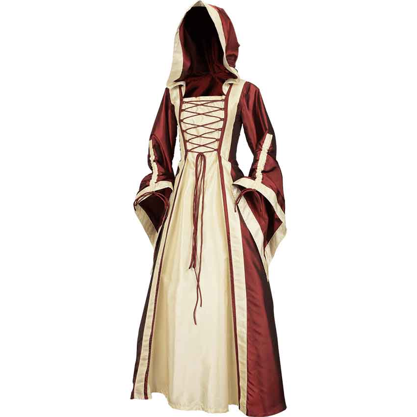 Charm your way into the hearts of the royal court when you wear the Hooded Renaissance Sorceress Dress in Burgundy. Made of high quality taffeta with an elegant shine, this hooded dress is perfect for medieval and fantasy occasions. The dramatic liripipe hood is quite roomy and ends in a stylish point, and the flared long sleeves can be cinched up with integrated cord for an alternate look. Lacing over the front accent panel as well as at the back allow you to adjust this medieval gown for the perfect fit. Choose from a range of accent colors for the trim on the sleeves, down the center of dress, and around the edge of the hood. No matter the occasion, you will certainly amaze all when you wear this hooded Renaissance gown.