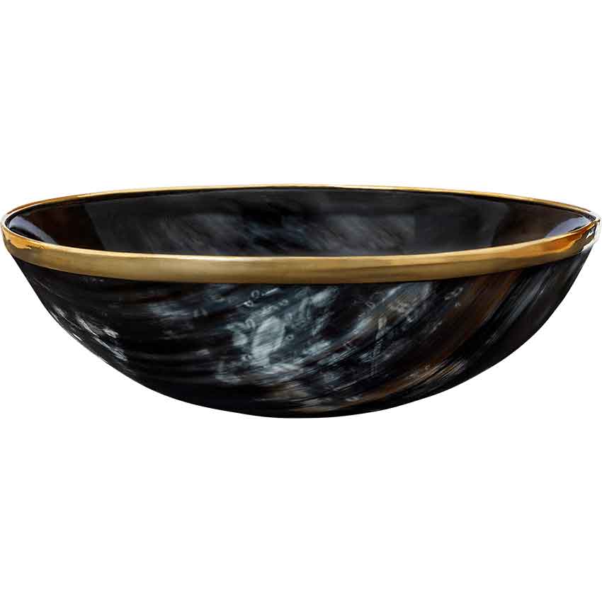 The natural hues and shades of the horn material create a mesmerizing palette of colors, making your medieval bowl a one-of-a-kind. In addition, those natural hues and shades personalize the bowl with a textured and layered look, guaranteeing an authentic medieval look. Furthermore, a pure brass rim crowns the bowl, adding a touch of luxury and durability.