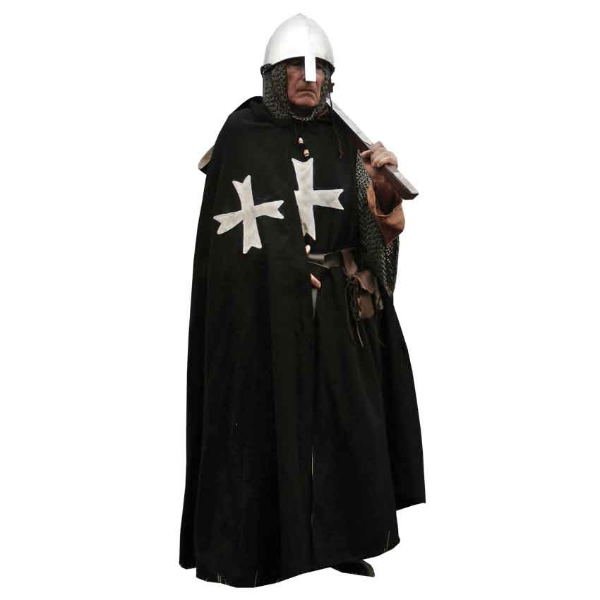 If you wish to join the ranks of the Hospitallers, make sure to don the Hospitaller Cloak to look the part of one of these mighty Crusaders. Made from a wool blend, this black medieval cloak has a cotton lining. Based on the outfits worn by the order, the full-length cloak ties at the neck. It has a hood with a white interior. The hood matches the white Maltese cross on the chest. This medieval cloak looks great for historical reenactments, faires, and more.