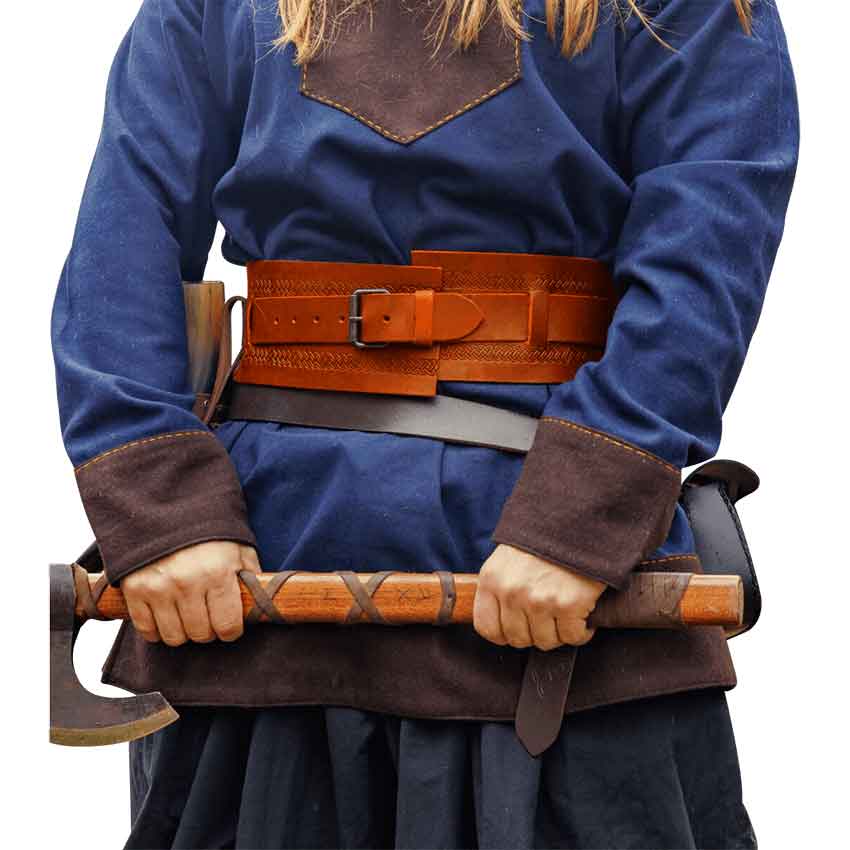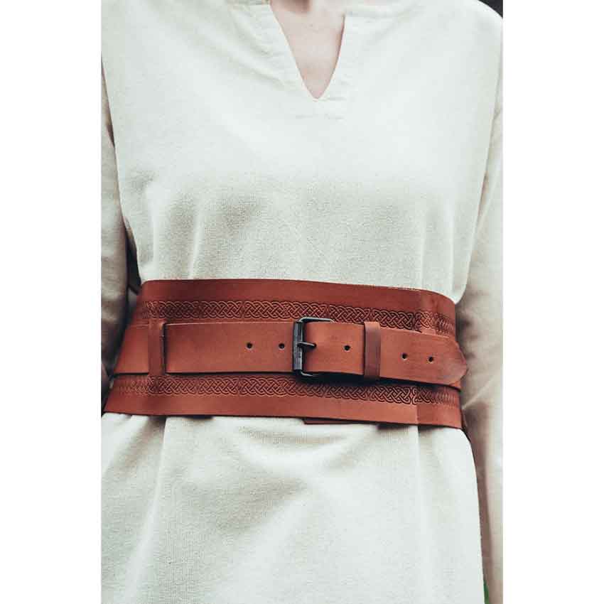 Roaming the vast, unforgiving landscapes of forgotten lands, the warrior secures the Ingrid Wide Viking Belt around their waist in preparation for the hunt. Adorned with intricate designs, the belt mirrors their strength and resilience.