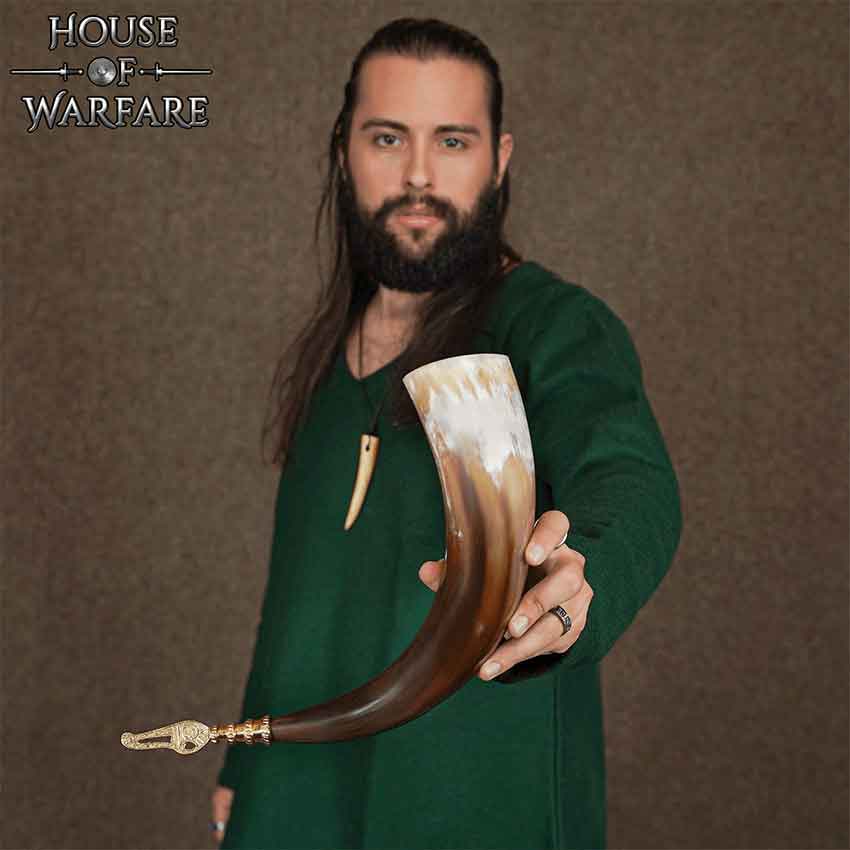 You raise your drinking horn in a toast to Odin and all the gods of Asgard. Then you take a drink in celebration out of the Ingvar Drinking Horn. Made of natural horn, this drinking horn has a brass end cap. Ornate detailing and curved designs adorn the tip of the end cap. The end cap also has four ridges above the tip. Finally, this horn is food safe and wonderful for drinking your preferred beverage. This horn looks great on display in your home or as part of a historical reenactment. You can also add this to a fantasy outfit or cosplay costume.