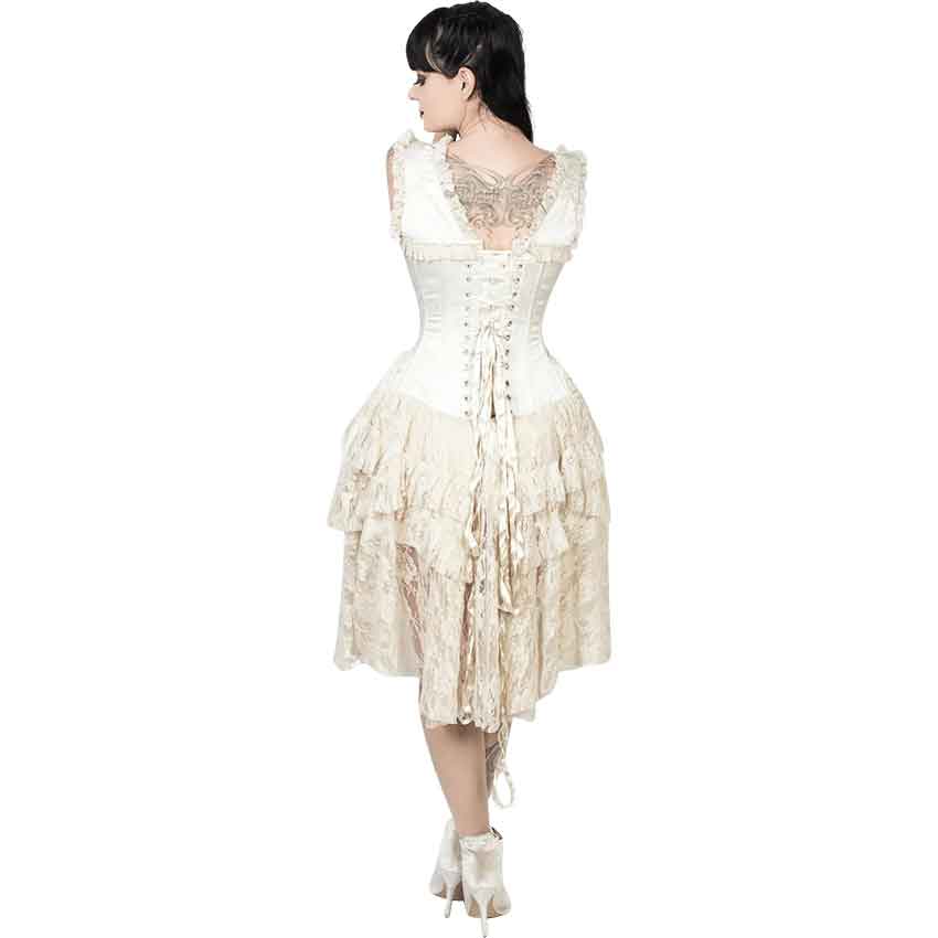 Next, layers of ivory floral lace form the short skirt. The high low design ends a bit shorter in the front than the back, where it falls just below the knees on most. This makes this steampunk corset dress great for layering over a contrasting skirt or showing off your favorite pair of Victorian or steampunk boots.