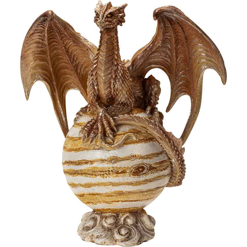 Step into a realm where fantasy meets the cosmos with this planet Jupiter dragon. Crafted from polyresin, this dragon statue features hand painted details that show off a true passion for art. The design depicts a brown dragon sitting on top of the gas giant, Jupiter, known for its crystal bands and its iconic Great Red Spot.