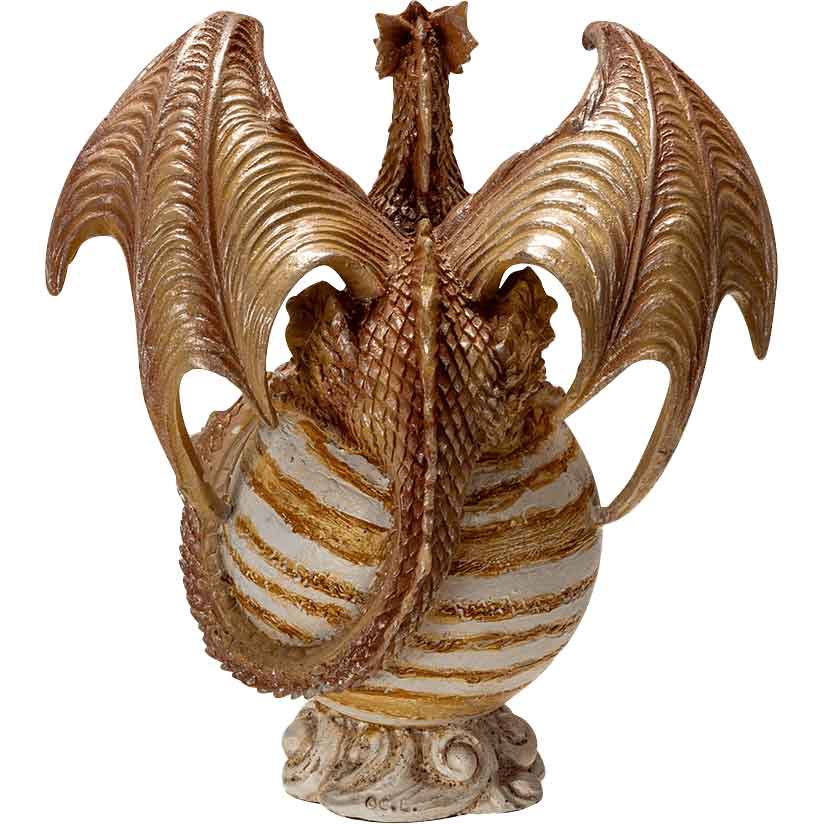 The dragon’s wings are extended and curl inward, giving it a mighty and majestic pose. The realistic carved scales have white accents for added detail. The tail wraps around the side of the gas giant and is held by the dragon’s claws in a casual resting pose.