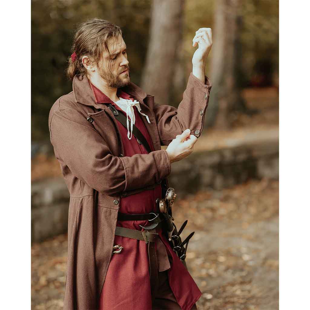 With a touch of drama embellishing its timeless look, the Kandor Greatcoat is ideal for steampunk adventurers, airship captains, and more. Made of heavy cotton canvas, this versatile coat can also be used for historical reenactments. This sturdy greatcoat features oversized sleeve cuffs, a tapering silhouette, large lapel panels, and a versatile collar. Fastened at the front with five buttons, each side of the lapel features a large panel decorated by four more matching buttons. The oversized sleeves are both extra wide and extra long. Turn the collar up to protect your neck against blustering winds or to simply up your style game. This versatile coat, also great for LARP use and a variety of historical reenactments, is sturdy enough to protect against the elements when treated with wax or various waterproofing sprays.