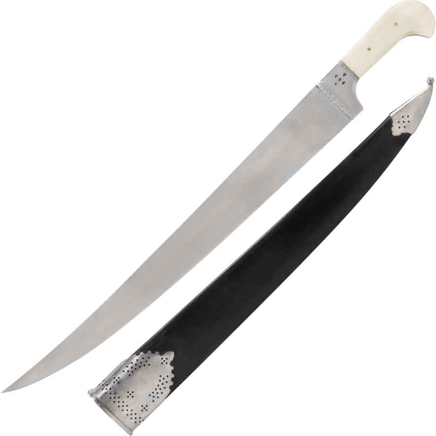 The ergonomic white ABS plastic handle is designed for comfort and security, featuring a slightly curved pommel and two bolted points to ensure a firm grip. The unique blade design with a straight spine and curved edge excels in both slashing and cutting.