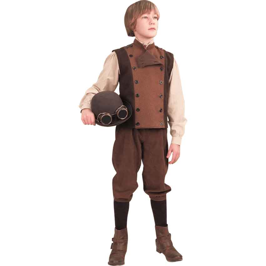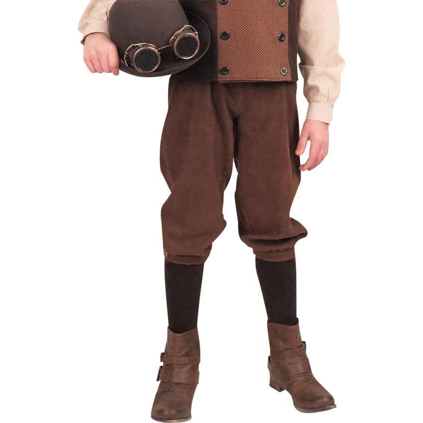 Our period Kids Edison Knickers are designed to fit youths, crafted in a chocolate brown corduroy. These boys knee pants have a back button for a good waistline fit and elastic at the bottom of the legs to keep the pants looking sharp. These kids breeches can be worn on their own or with knee socks, like in the photo. Knee socks do not come included. These boys period pants are sure to become a favorite choice for kids costume apparel.