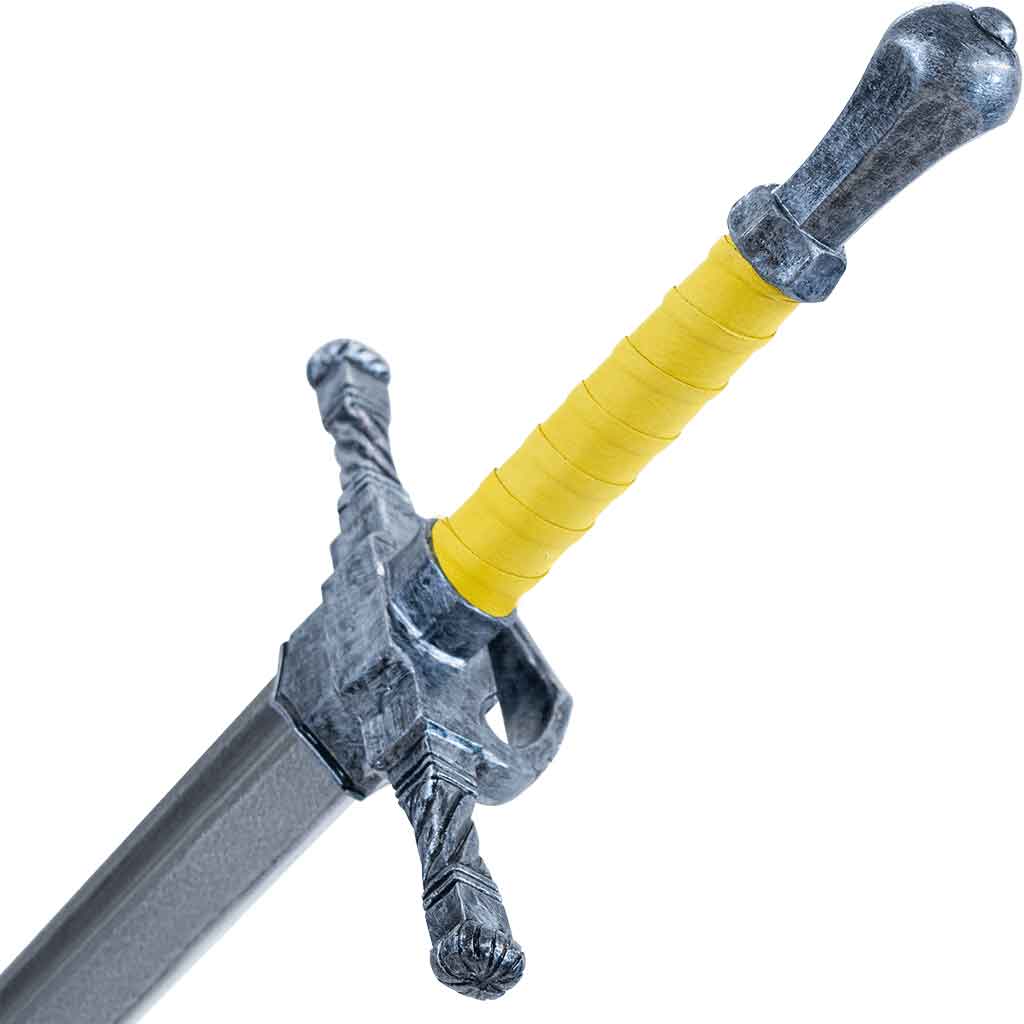 Moving down the length, the cruciform crossguard has twisted quillons. These quillons end in notched points. Further down, the handle is wrapped in leather and available in two colors. The leather comes in Blue or Yellow. The Blue handle has a bronze-colored hilt. The Yellow handle has a steel-colored hilt. This fantasy sword accommodates a one-handed grip. On the chappe, also known as the middle of the crossguard, there is a notched ring guard. The ring guard not only protects your grip, it also adds parrying options in combat. The hilt ends in a fluted scent-stopper pommel for realistic detail. A latex-free waterproof coating covers this safe foam weapon.