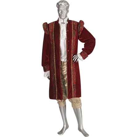 It is traditional that a lord should have the noblest, most elegant garments of his subjects. If you are wearing the King’s Renaissance Jacket, then you are dressed in a kings regalia, because it is hard to find a jacket that is more stylish or elegant. This elaborate and attractive jacket is made from high-quality red velvet and features baroque decorations rendered in attractive damask brocade. Being made from velvet, this jacket has a luxurious and soft feel that makes it exceedingly comfortable to wear. The jacket is approximately knee-length and features attractive damask brocade decoration on both the front and back. These decorations are red with gold floral pattern detailing and feature additional gold trim. The jackets full-length sleeves are fitted to the arm and end in damask brocade cuffs. The shoulders are slightly raised, creating a circular ridge that adds a level of depth to the jacket. The interior of this frock-styled jacket is fully-lined for comfort. The jacket is pictured above with a renaissance dress shirt and gold breeches, neither of which is included with the jacket itself. No self-respecting lord would ever be seen in anything less regal and elegant then the King’s Renaissance Jacket.
