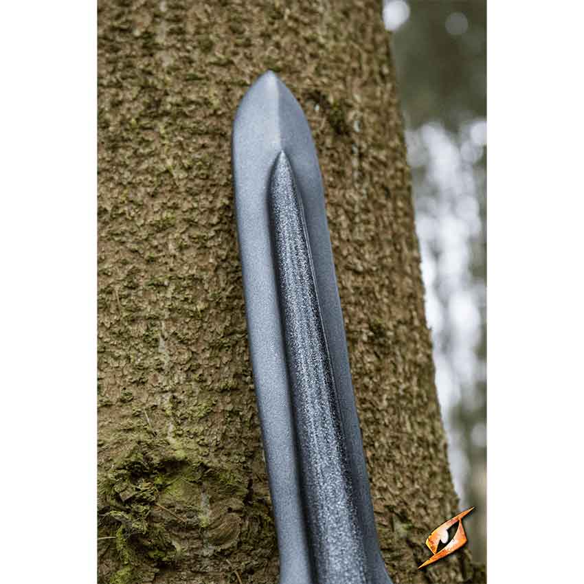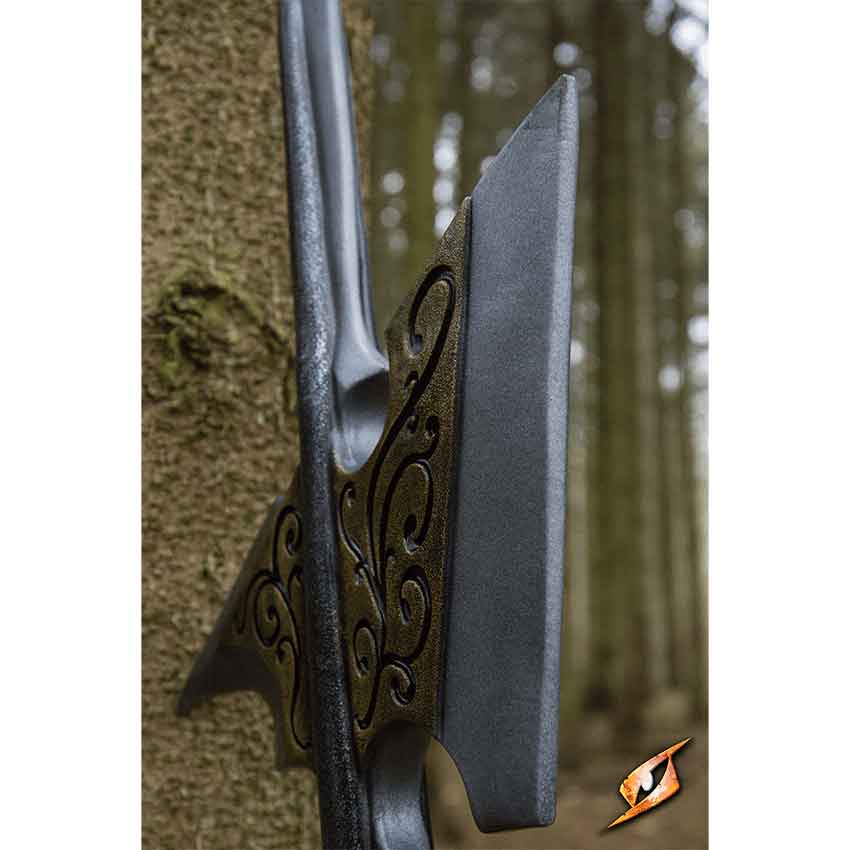Defend the kingdom and strike down your foes with the Kingsguard LARP Halberd. Combining the best bits of an axe and a spear, this unique medieval weapon is made safe for LARP through its high quality, closed cell foam construction. Resistant to shredding and coated with latex, this LARP pole weapon has a flexible fiberglass core with a Kevlar tip. The spear portion has a double-sided look, beneath which is situated an ornate axe decorated with artistic, swirling vines over an antique brass background. A dark wood finish lends a realistic look to the foam handle. For reach, versatility, and style, wield this medieval LARP halberd during your next LARP battle.