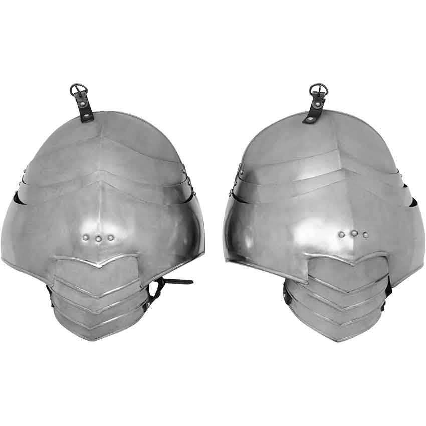 At the top, sturdy buckles await to be fastened onto a gorget, providing a seamless armour integration that enhances both protection and style. The true allure of this medieval arm armour lies in its intricate design. Consisting of overlapping plates, they boast wide shoulder plates that not only make a bold statement but also offer enhanced protection near the underarm area.