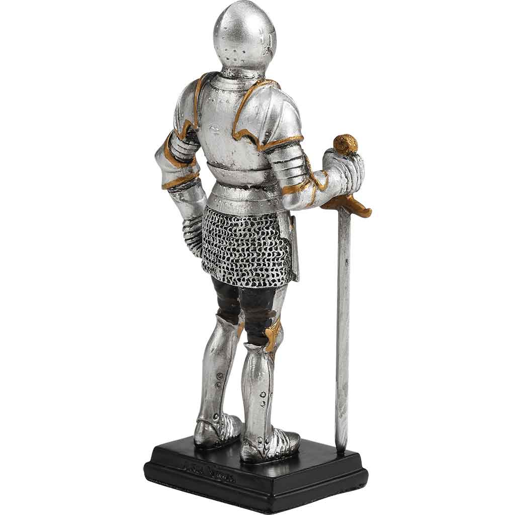 The front plackart is carved to look like the cuirass consists of two pieces held together by a golden buckled strap. Two studded golden flowers add a hint of regal detail to the pauldrons. The faulds of the tassets connect to two grooved plates. The knee poleyns have golden trim. In his hand, the knight holds a sword with a silver blade and golden hilt. The knightstands on a black base, making it easy to place it on most flat surfaces.