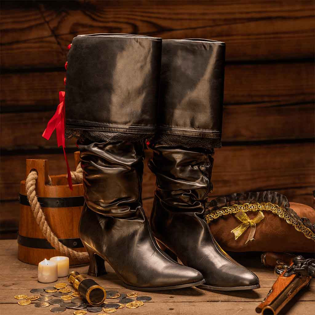 Our Ladies Captain Morgan Pirate Boots are perfect for the female Captain. These fun and flirty boots have a 2.5-inch heel and a folded over cuff that has red ribbon lacing and is trimmed with black lace. These boots are a must-have for any Wench or Maiden. Available in Black synthetic leather and comes in Womens standard sizes 5-11.