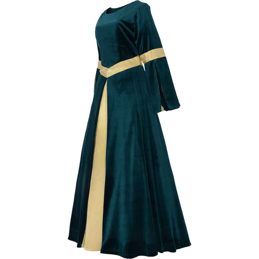 The Ladies Velvet Renaissance Gown is perfect for royalty, nobility, and all those wishing to dress with refined beauty. This royal velvet dress has satin accenting the waist, its sleeves, and set as the front accent of the long, full skirt. The neckline is rounded, and the long sleeves are slit up to the satin trimmed elbows, revealing an inner layer of satin. At the waist, a slightly angled band of satin gives flattering visual definition. The velvet of the skirt is parted at the front to reveal the satin accent panel. A hidden zipper fastens the dress at the back, and adjustable lacing over it helps achieve the perfect fit. Choose from a variety of royal velvet colors and between gold and silver for the satin accents. This full length medieval gown is offered in a range of sizes and is perfect for Renaissance fairs, medieval events, costume balls, and other special occasions.