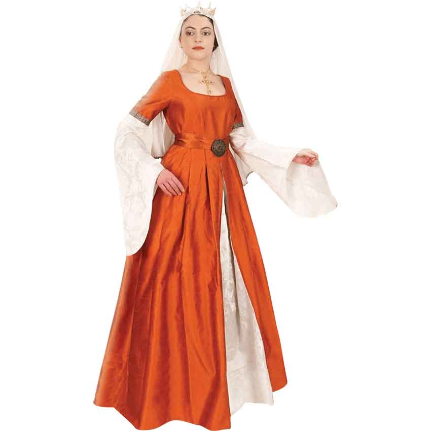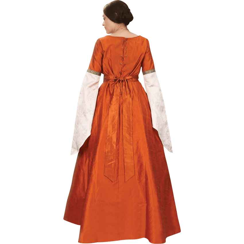 Ladies and damsels should look their best at court. Wear the Lady of Shalott Dress and impress your fellow nobles and courtiers with your royal style. This dress is available in four sizes. Made from amber taffeta and champagne brocade, this medieval gown features a scoop neckline, wide sleeves, and pleated waistline. A sash belt has a detailed metal medallion in the center. The sash ties in the back. An ornate band separates the sleeves into two sections and matches the bronze tone of the medalion. The top half of the sleeves have the amber taffeta while the lower sections feature the brocade. The gown also has a fully lined underskirt made of cotton. It laces up in the back with a modesty panel and stitched taffeta ribbon. It is an ideal dress for medieval faires, fantasy events, and cosplay conventions.